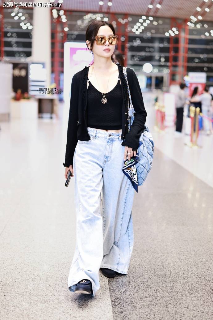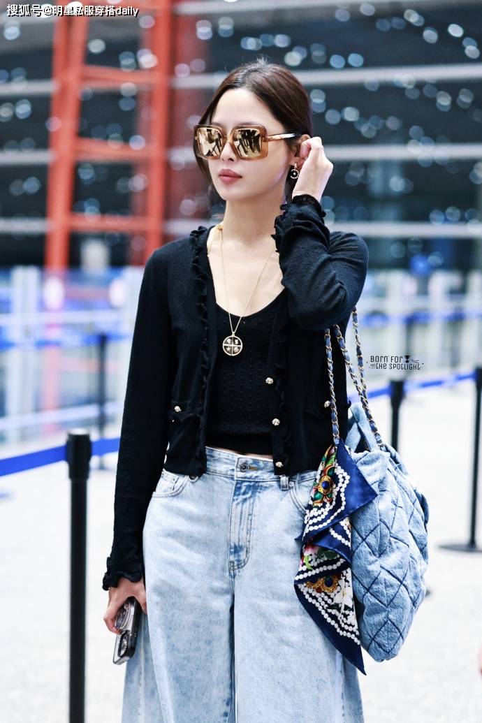 若说上半身的黑色营造了稳重氛围,那么下半身的蓝色阔腿牛仔裤就是整套造型的点睛之笔。蓝色与黑色的对比,瞬间打破深色的厚重,为整体注入灵动清新。阔腿裤的版型更是修饰腿部比例的“利器”,高腰设计拉长身材曲线,配合牛仔面料的复古感,使整体造型在休闲中依旧保持精致。